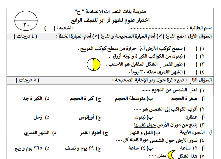 اختبار علوم لشهر فبراير للصف الرابع الفصل الثاني المنهاج الفلسطيني الجديد