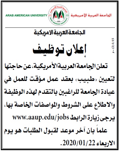 طبيب مقيم عقد مؤقت الجامعة العربية الامريكية جنين
